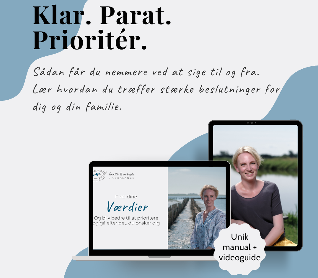 - Tydelig prioritering af, hvad der er vigtigt for dig og en klar retning for, hvordan du skaber balance